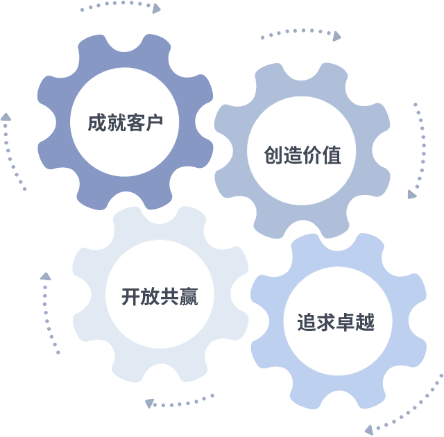 成就客户是一切决策的出发点,,,创造价值是衡量所有工作的标准,,,追求卓越是我们做事做人的态度,,开放共赢是我们的格局也是最终的结果。。。。价值观的齿轮环环相扣,,推动着组织里的每个人不断向前。。。。
